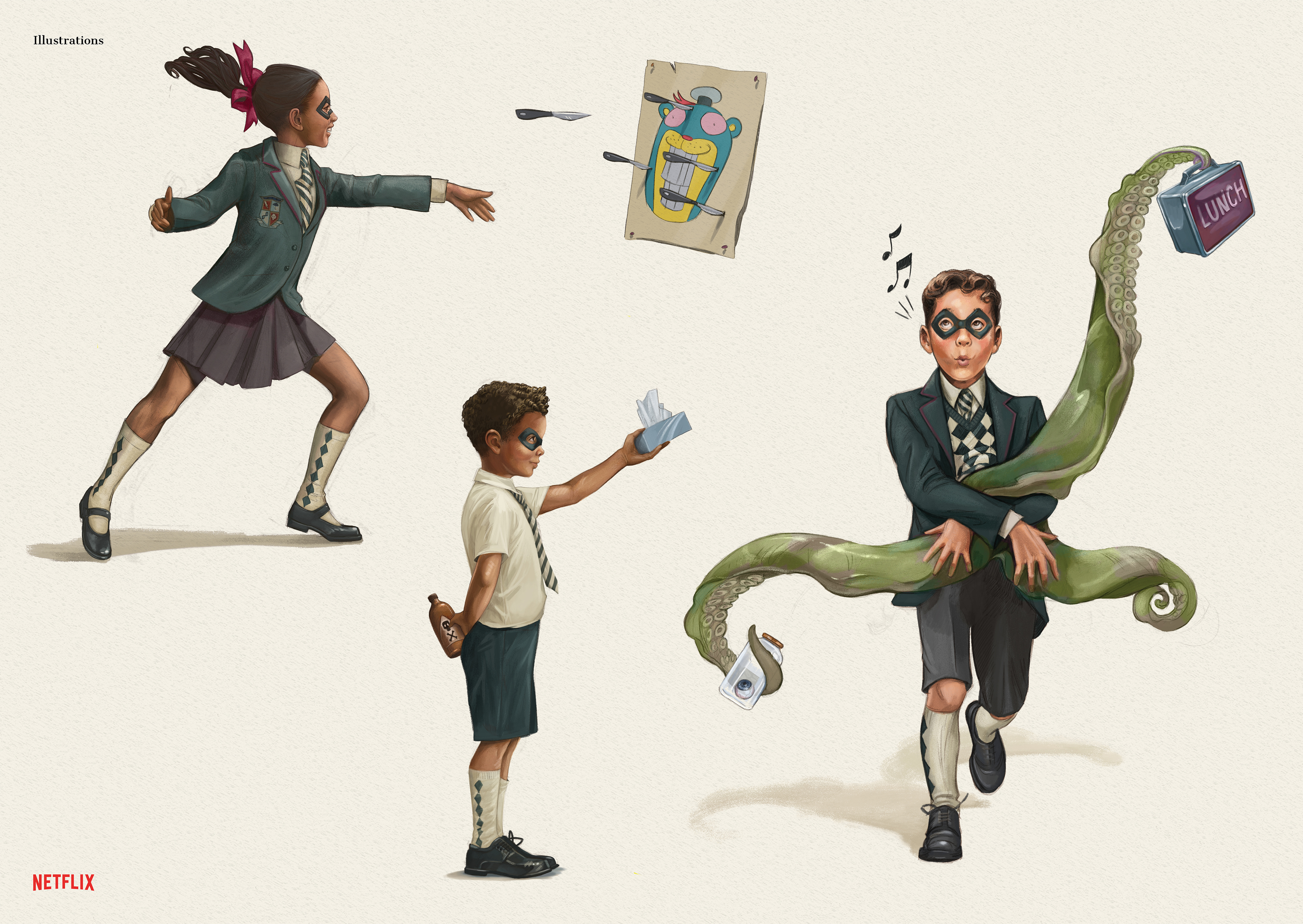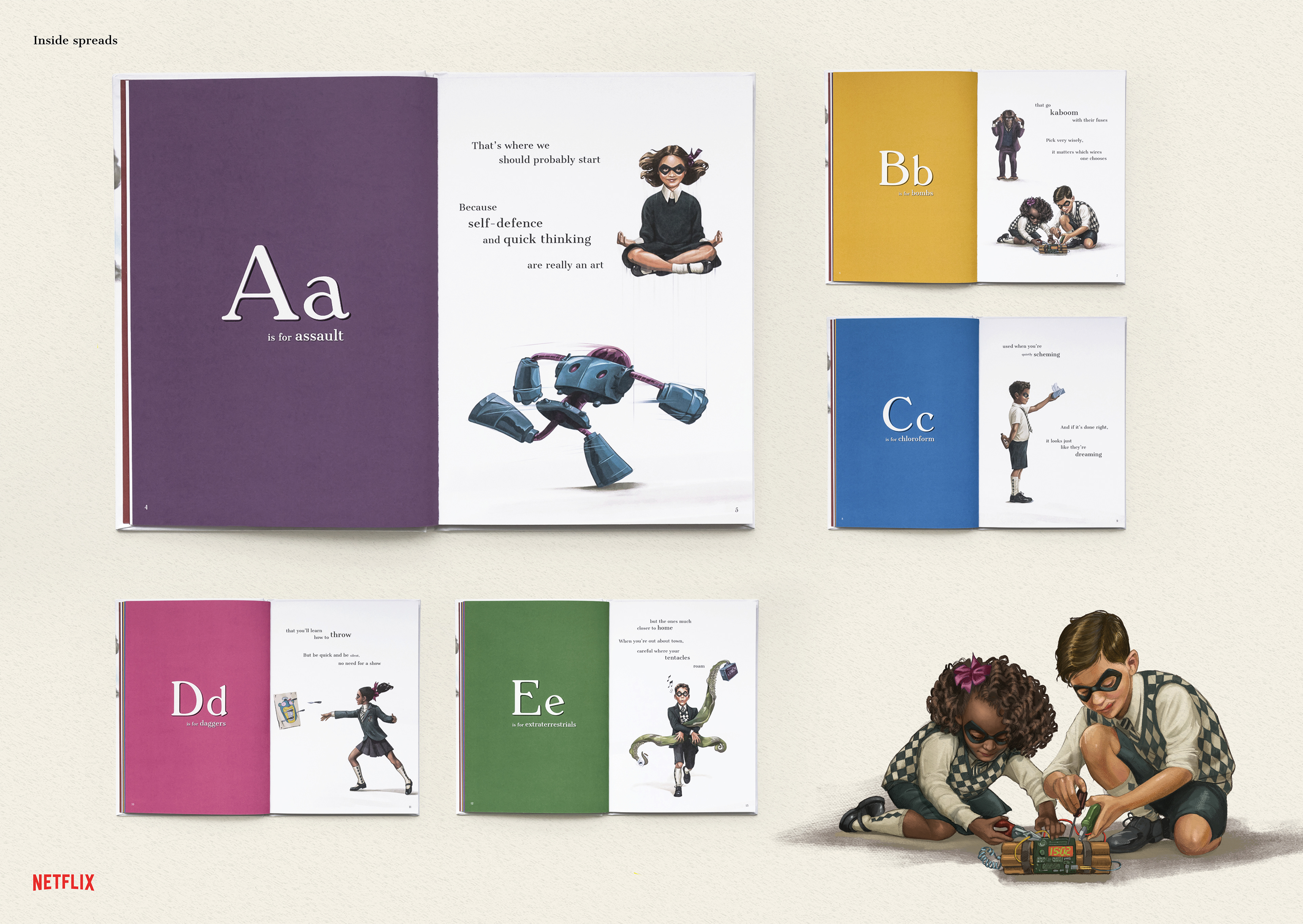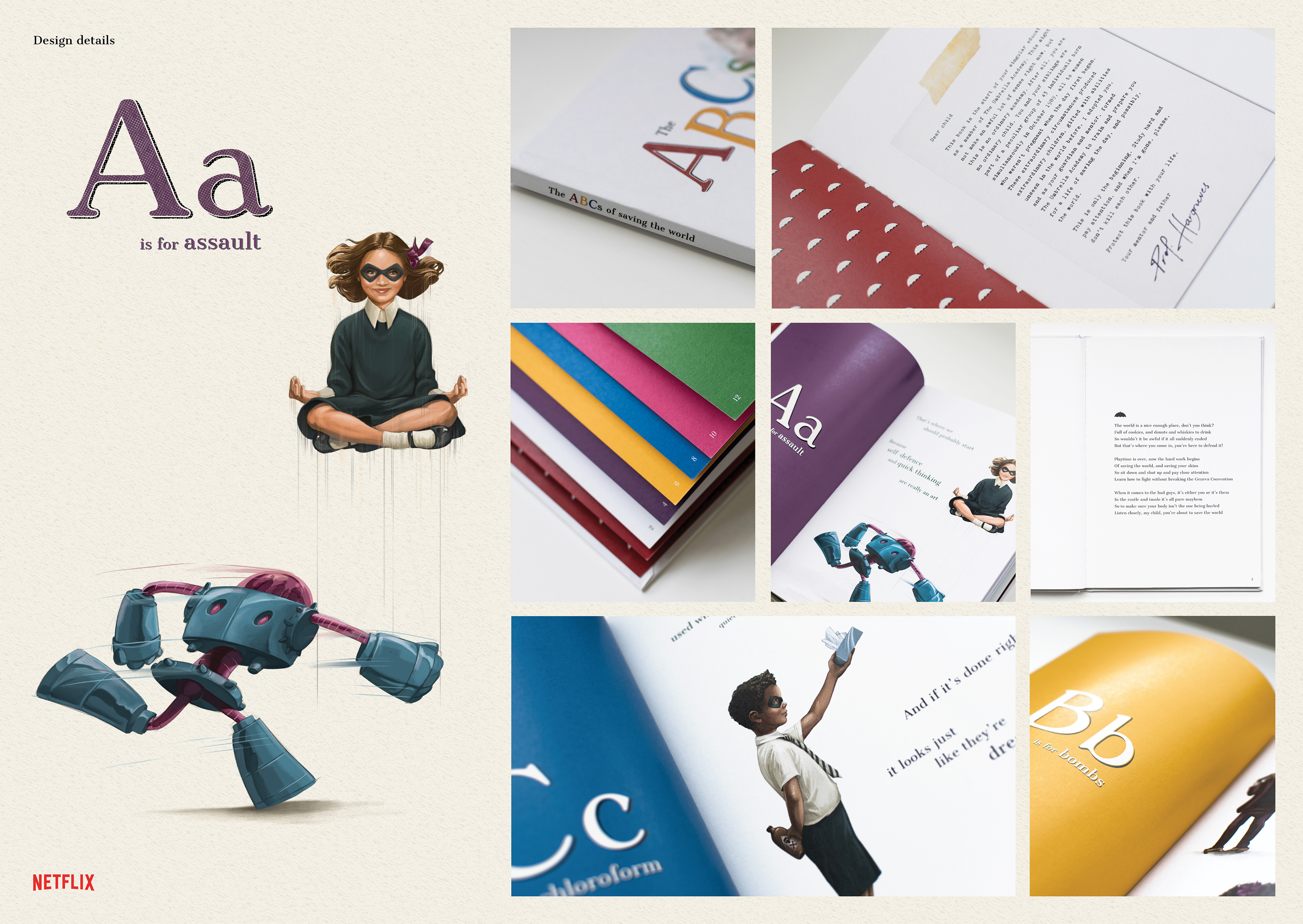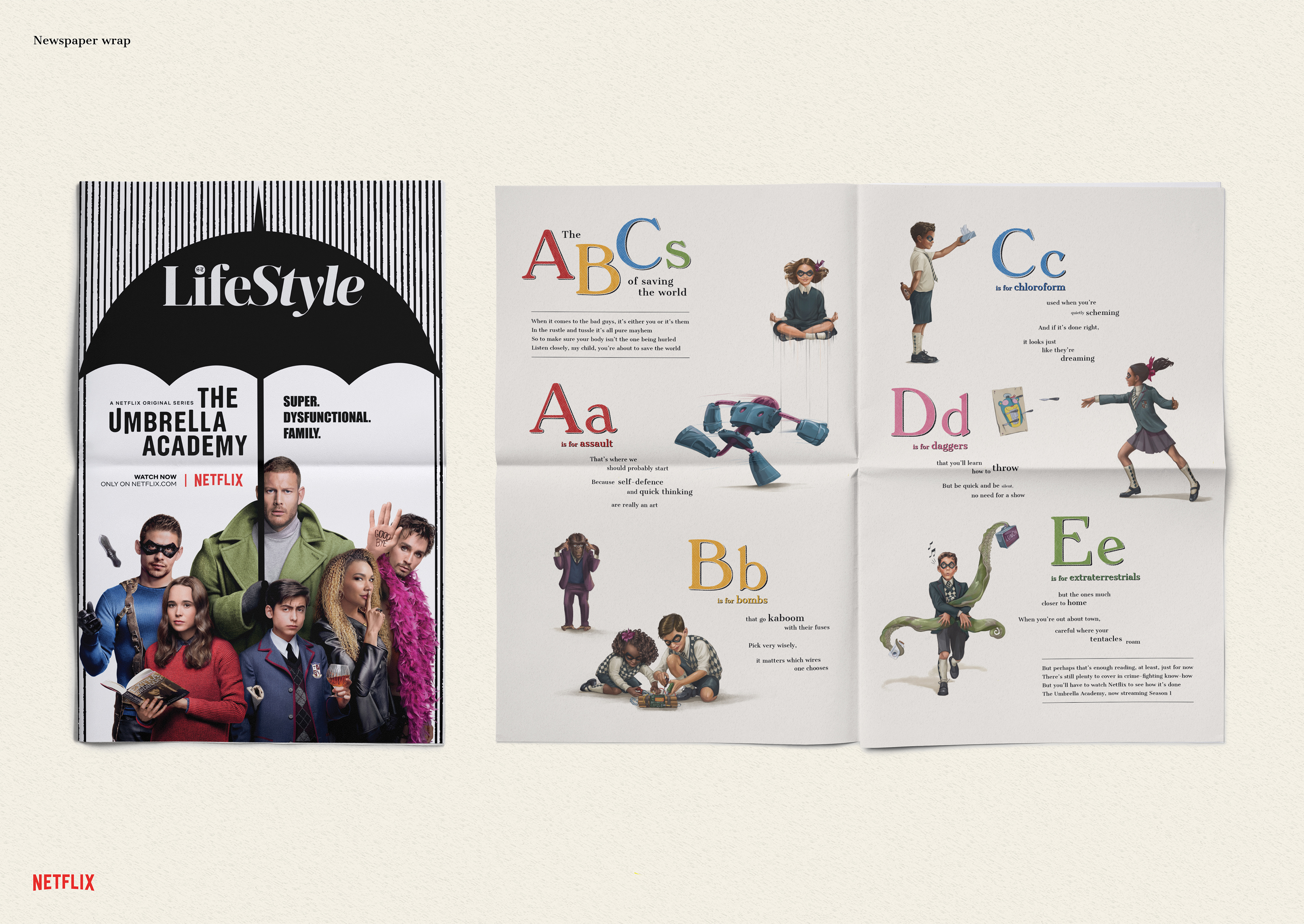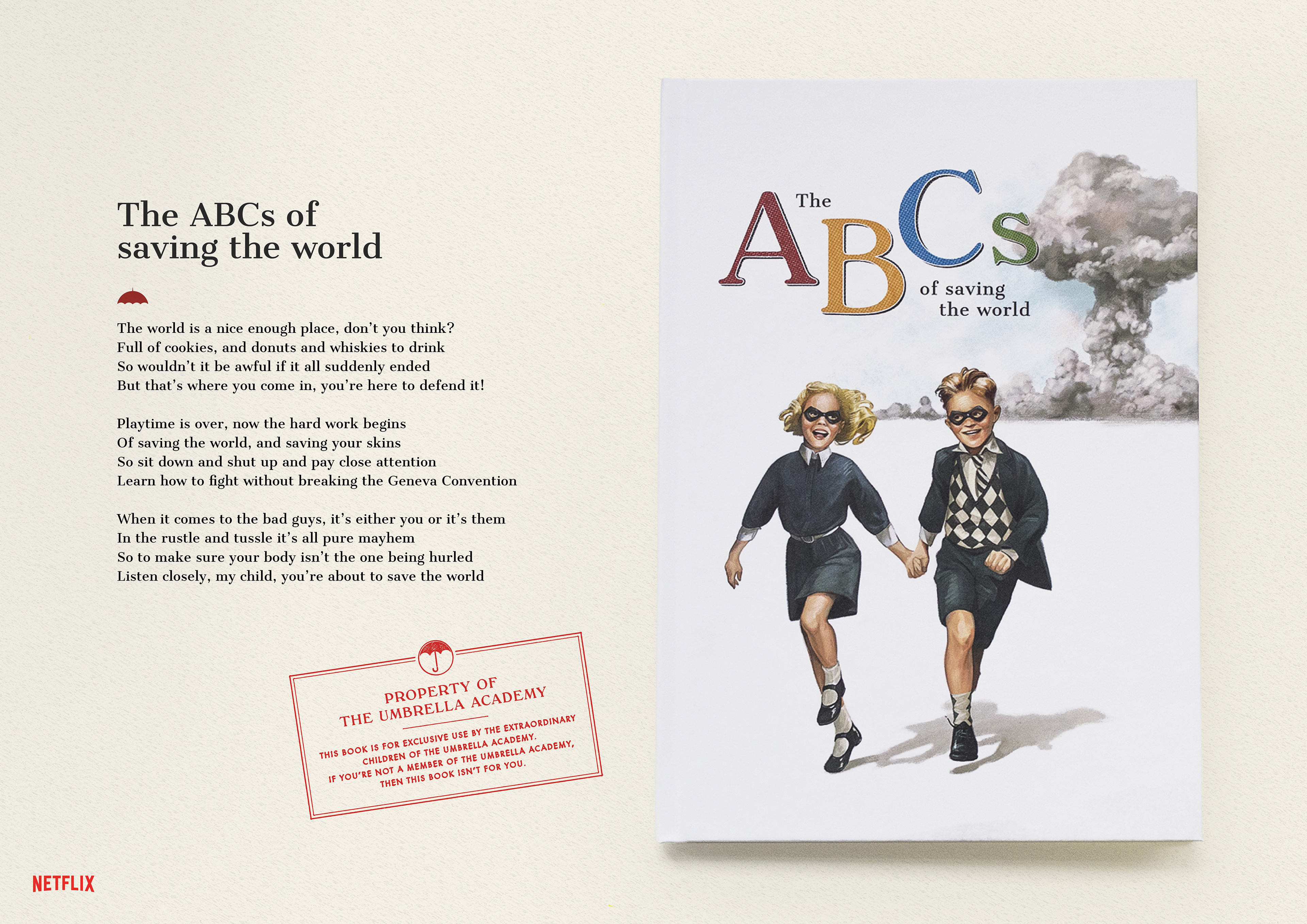 We decided to bring a piece of the twisted nature of The Umbrella Academy to life. We created the first children’s book that covers everything the members of The Umbrella Academy might need to know, from defusing bombs to controlling extraterrestrial tentacles. Using cues from the show and the characters, we published the A to Es in The ABCs of saving the world. Illustrated and written in the same style as a children’s book, this book is aimed to help you save the world.