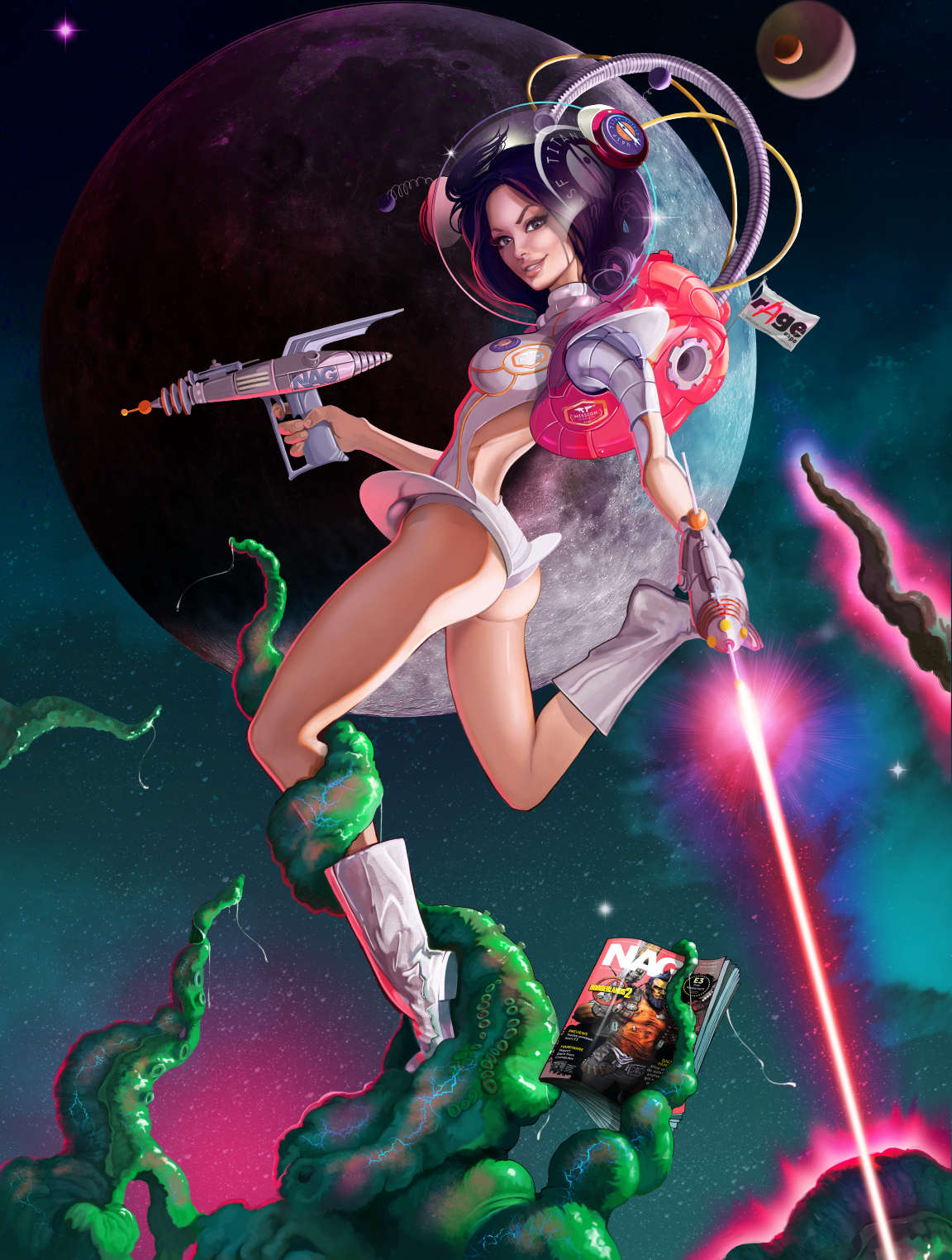 This is the new mascot for the 2015 rAge Expo in Johannesburg. Created digitally for NAG magazine. The brief was to create Roxy with a classic retro space pinup feel.