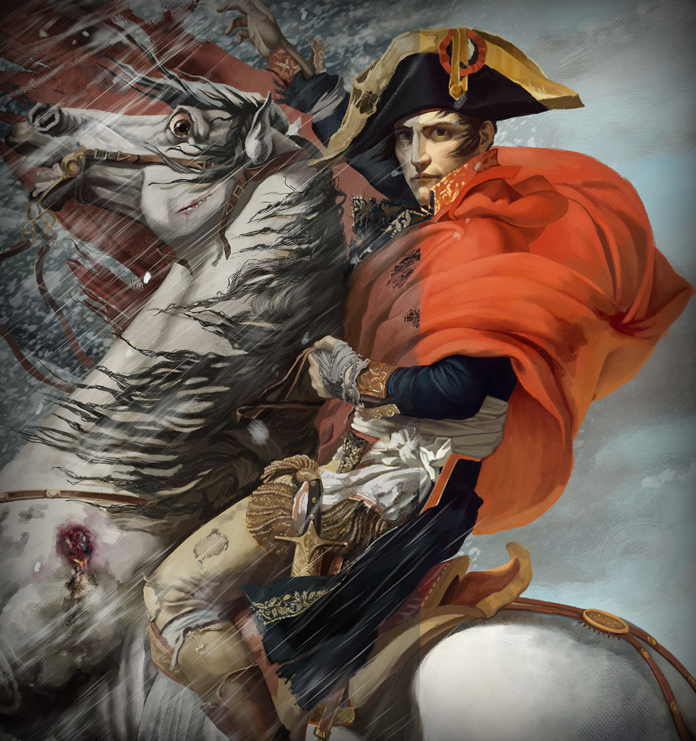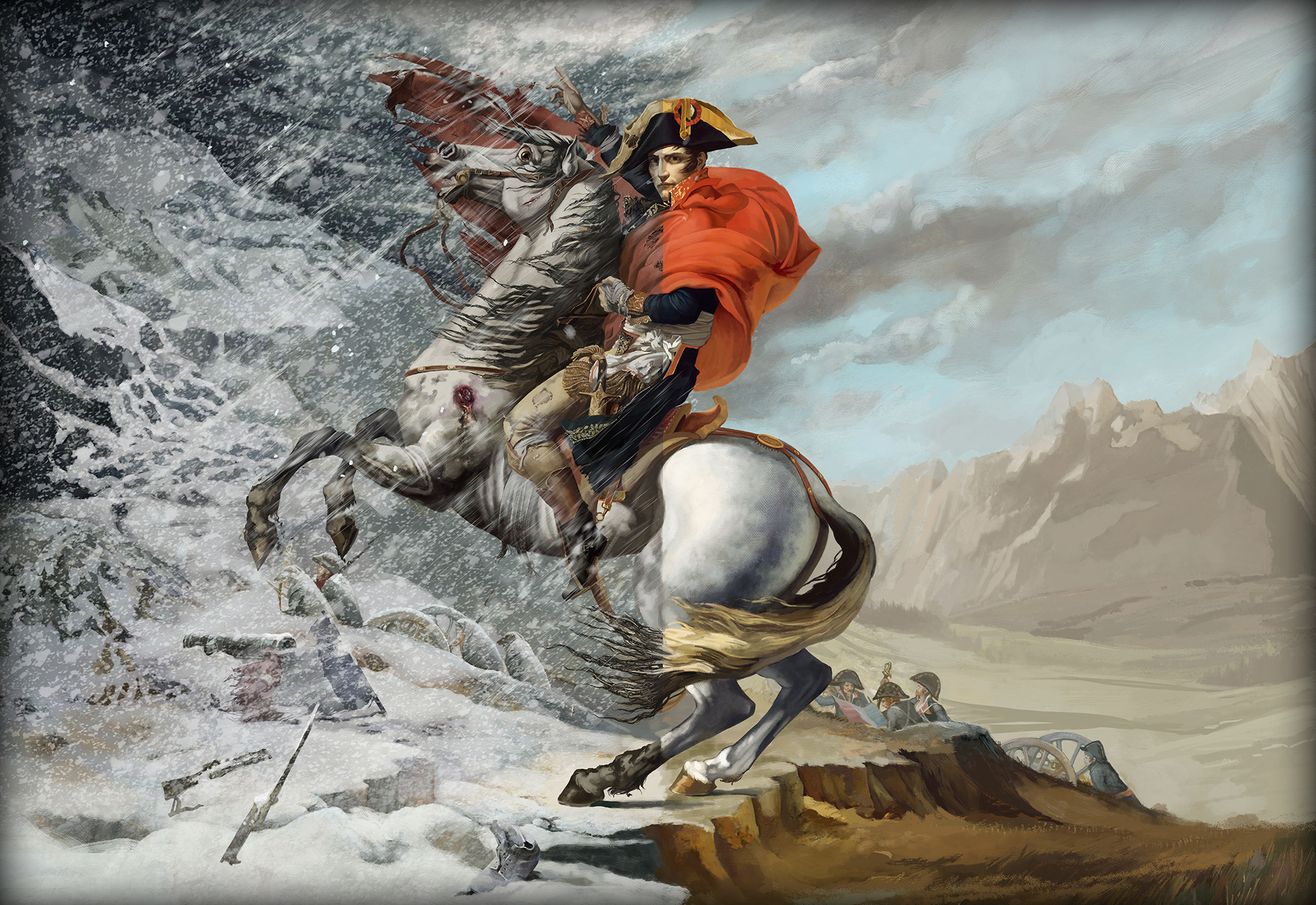 A take on the Famous Painting done by French NeoClassical Painter Jaques-Louis David " Napoleon at the Saint-Bernard Pass " 1801. I was asked to recreate the painting entirely and divide the canvas into 2 events, that of Napoleon making a decision to cross the Alps and another deciding against the crossing.