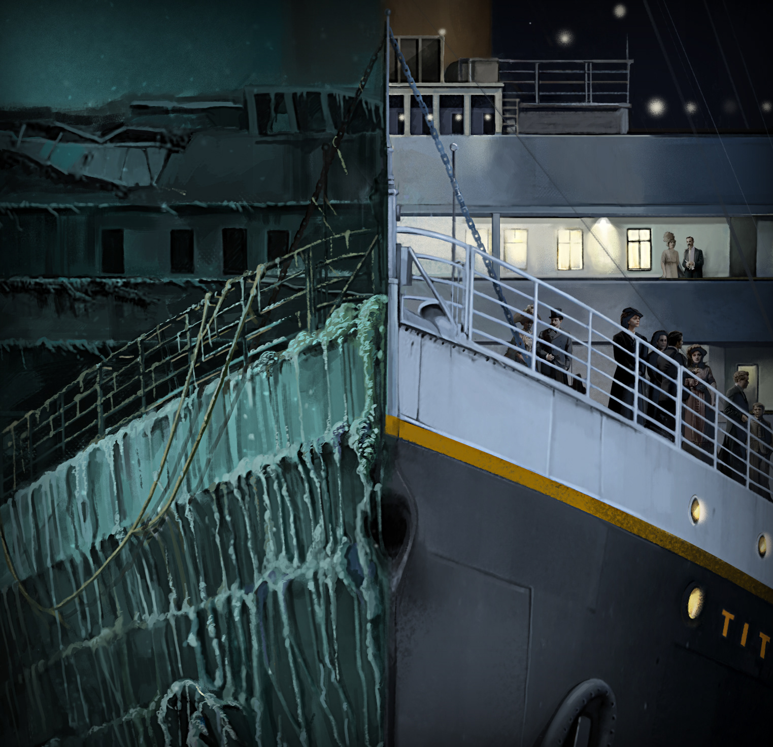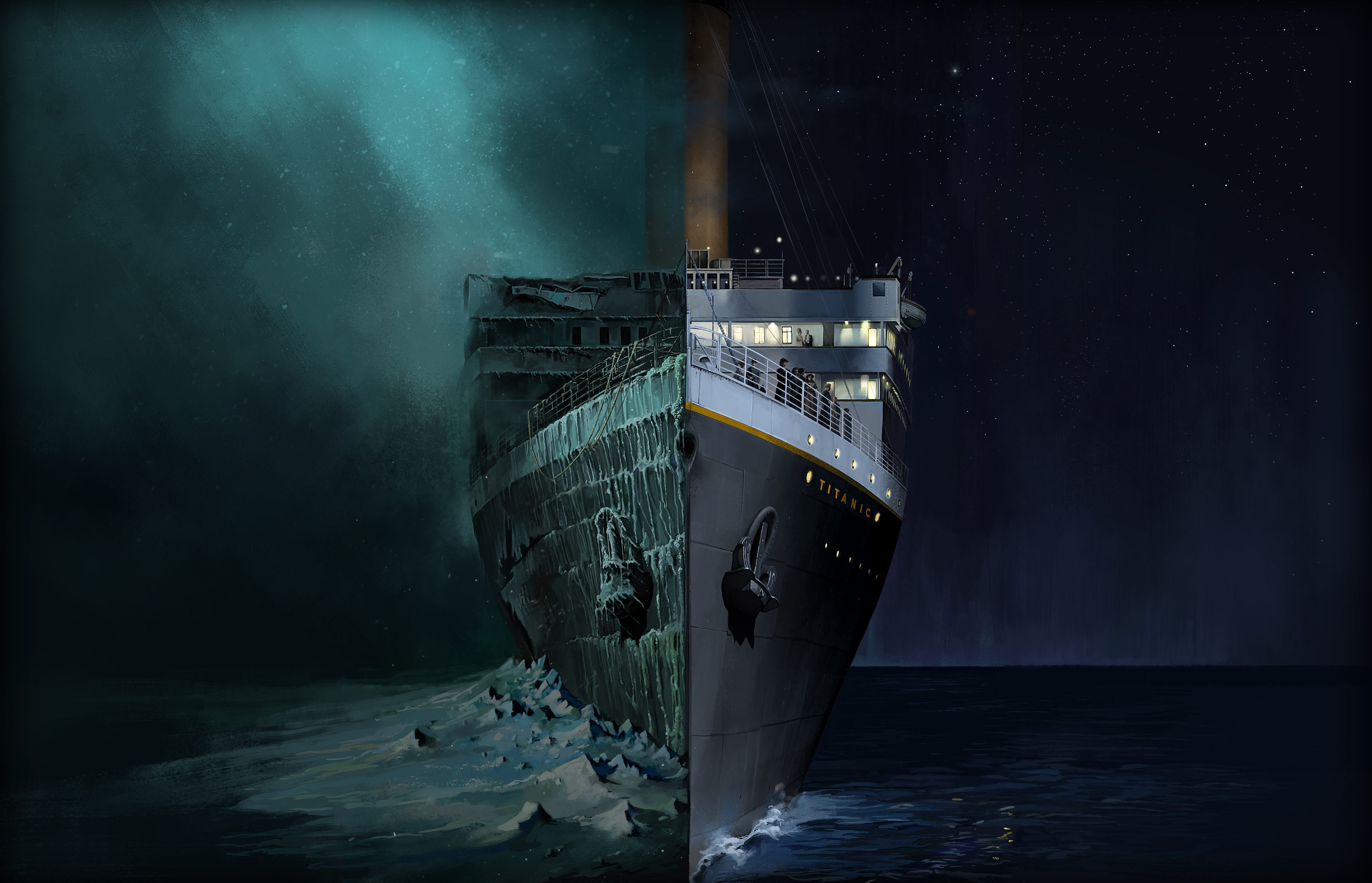 The Titanic. In this piece I was asked to create 2 scenario's in the a single image - that of the Titanic havimg made the decision to hasten her journey and another had she not.